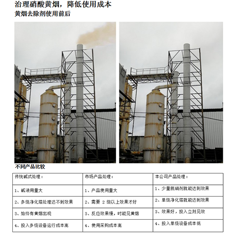 硝酸黃煙去除劑(脫硝劑)能和硝酸氣體(黃煙)即:氮氧化物進(jìn)行化學(xué)還原反應(yīng),生成氮?dú)狻⑺?、水蒸汽等無(wú)害物質(zhì),消除NO2、NO(黃煙)的隱患。